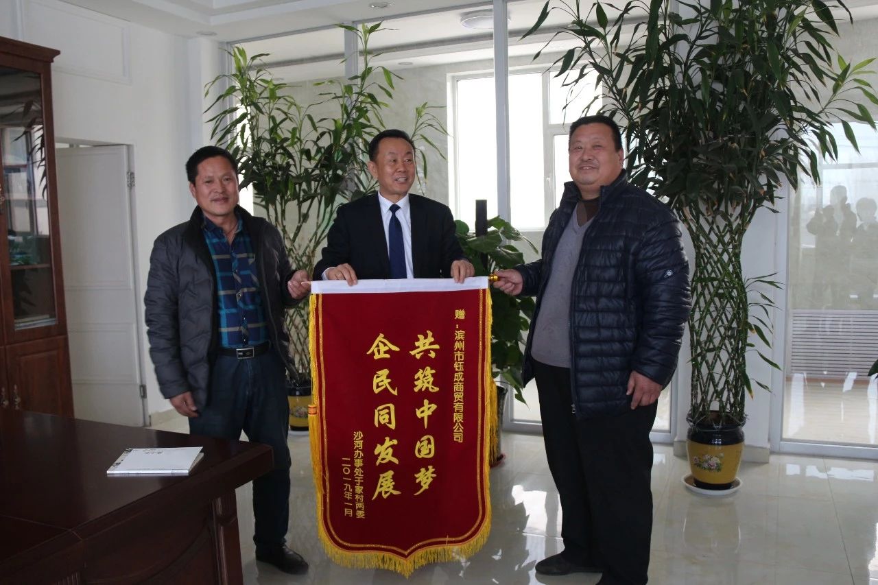 1月30日,于家村“兩委”將一面寫著“企民同發(fā)展 共筑中國夢”字樣的錦旗送到了濱州鈺城商貿(mào)有限公司,感謝企業(yè)一年來對于家村發(fā)展所做的貢獻(xiàn),這也是我辦“村企共建”的典型事例。通過村企共建,有效的推進(jìn)了企業(yè)和農(nóng)村和諧共處、相互促進(jìn)、共同提高。